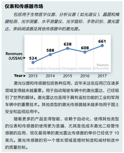 預(yù)計(jì) 2017 年激光器在儀器儀表和傳感器市場(chǎng)中的銷售額將達(dá) 6.61 億美元,比 2016 年的 6.08 億美元顯著增長(zhǎng)8.7%。雖然儀器儀表和傳感器市場(chǎng)的規(guī)模,大約是醫(yī)療和美容市場(chǎng)或科研和軍事市場(chǎng)規(guī)模的 2/3,但是該市場(chǎng)擁有巨大的增長(zhǎng)潛力,因?yàn)橐恍┳灾骰蛑悄軕?yīng)用(如激光雷達(dá))對(duì)傳感激光器的需求量非常巨大。