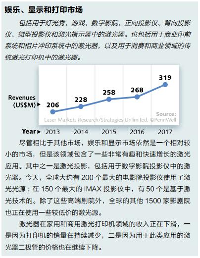 盡管上述應(yīng)用中所使用的激光器歸結(jié)到材料加工市場(chǎng)中的打標(biāo)部分,但是消費(fèi)市場(chǎng)對(duì)這種激光打標(biāo)方法越來(lái)越多的接受,仍然證明了激光技術(shù)在全球的適應(yīng)性。2016年,激光器在娛樂(lè)、顯示和打印市場(chǎng)的銷售額再次增長(zhǎng)至2.68 億美元,預(yù)計(jì) 2017 年將大幅增長(zhǎng) 19%、達(dá)到 3.19 億美元,增長(zhǎng)的主要驅(qū)動(dòng)力將來(lái)自激光影院設(shè)備。