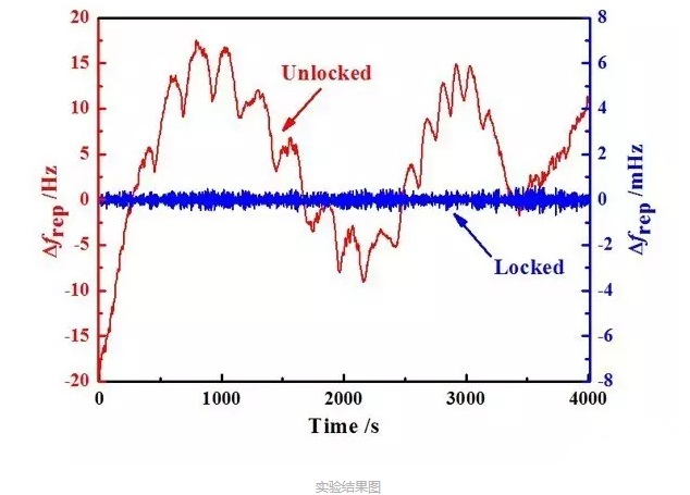 實(shí)驗(yàn)進(jìn)一步比較了自由運(yùn)轉(zhuǎn)與重頻鎖定狀態(tài)下激光器重頻的變化情況,如上圖紅色和藍(lán)色曲線所示??梢钥闯觯捎诃h(huán)境溫度變化,激光器重頻自由漂移范圍為±20 Hz。