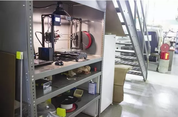 Swiss Automation公司生產(chǎn)的LulzBot Taz 5放置在連接Barrington機(jī)加工車間兩側(cè)的走廊樓梯下面,往左可以看到一臺(tái)3D打印設(shè)備,其有機(jī)玻璃護(hù)罩橫跨機(jī)柜的前部,以防止3D打印機(jī)在運(yùn)轉(zhuǎn)過程中碰觸到車間內(nèi)的油和其他碎片。