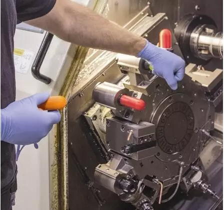 機(jī)械工程師Daren Johnson在Swiss Automation公司生產(chǎn)的Eurotech車削加工中心內(nèi)安裝刀具護(hù)罩。在某些情況下,員工僅在距離車床轉(zhuǎn)塔刀架數(shù)英寸遠(yuǎn)的地方操作,這些安裝護(hù)罩可提供必要的防護(hù),以防止碰撞、割傷和擦傷