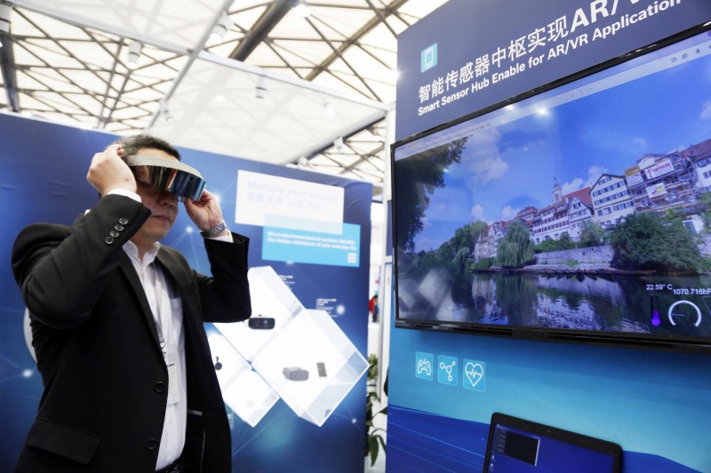 1、圖為博世集團(tuán)展示的智能傳感器中樞實(shí)現(xiàn)AR(增加現(xiàn)實(shí))、VR(虛擬現(xiàn)實(shí))應(yīng)用,一位展商戴上眼鏡體驗(yàn)。