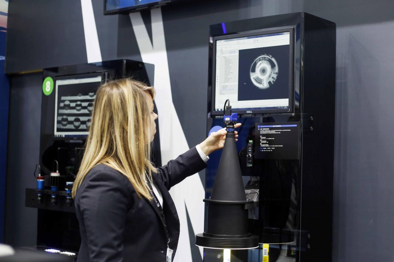 4、外國展商調(diào)節(jié)一臺光學(xué)機(jī)械系統(tǒng),該儀器具有高光強(qiáng)度的頻閃光源和高分辨率、低畸變的紅外鏡頭,不用旋轉(zhuǎn)也可從部件側(cè)面進(jìn)行檢測測量。
