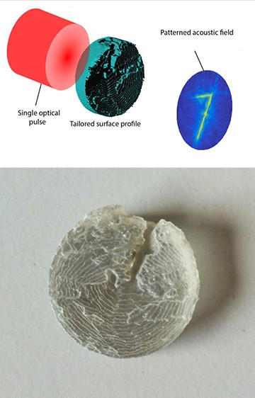 首先研究人員設(shè)計了一個盤狀的靶材料,盤上不同位置的垂直深度不同,利用激光脈沖產(chǎn)生特殊的聲場需要周期性地調(diào)制這個深度。這就成了一種光聲透鏡——一個塊狀的不規(guī)則表面,光作為輸入信號,從而產(chǎn)生特定結(jié)構(gòu)的聲場。接著他(她)們開發(fā)出一套數(shù)值算法,將用戶設(shè)想的3D聲場作為輸入信息,計算得到產(chǎn)生這種聲場所需的光聲透鏡的表面物理結(jié)構(gòu)。