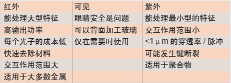 上表顯示了本文所討論的三種波長的一些特征。 簡而言之,紫外光子的成本更高,并且其功率比紅外光子更低,但是可以實(shí)現(xiàn)更小,更清潔的特征,并且材料去除更為精確,但要比使用紅外光子更慢。 可見波長用于需要的應(yīng)用領(lǐng)域,例如透明材料的背面處理或去除氧化銦錫(ITO),但鑒于眼睛安全問題,通常首先考慮其它的替代方案。