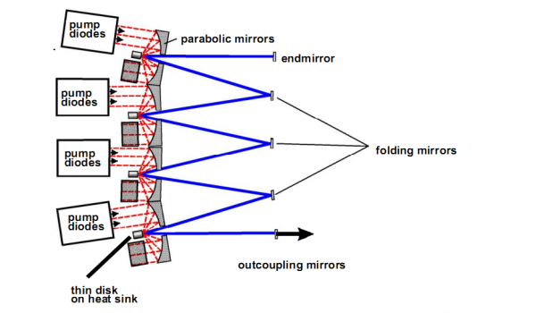 不同于光纖激光器,大功率薄片激光器是將多個二極管泵浦的晶體薄片串聯(lián)在一個諧振腔里,通過設(shè)計大模場的腔模式,與光纖激光器相比優(yōu)點是可以運作在大能量上,而光纖運行在大能量模式上則難免造成較強(qiáng)的B積分,影響光束質(zhì)量。