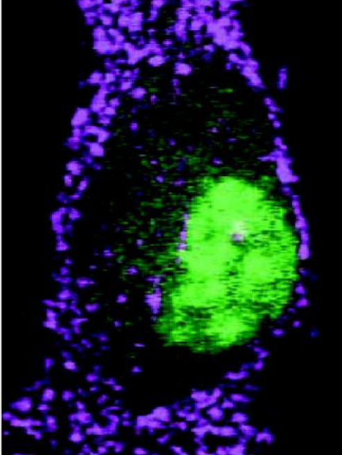 圖為雙光子熒光和三次諧波技術(shù)結(jié)合的神經(jīng)細(xì)胞圖像。綠的是細(xì)胞核,紫的是細(xì)胞邊緣。激光中心波長810nm。