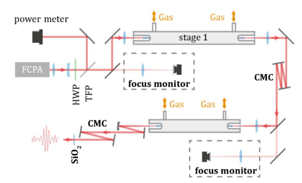 例如前面提到的光纖和薄片,結(jié)合飛秒脈沖以及光譜展寬技術(shù),各自實現(xiàn)了高平均功率的周期量級光脈沖。
