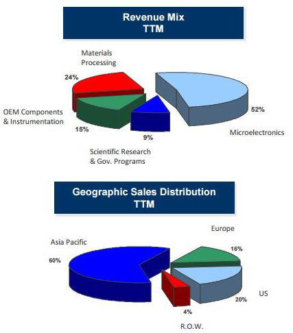隨后舉行的業(yè)績發(fā)布會中,公司CEO說明,2017第二季度市場需求持續(xù)旺盛,尤其是來自中國的微電子加工業(yè)的需求,從歷史數(shù)據(jù)看公司用于微電子加工業(yè)的激光器占比也是逐步提升。我們認為公司的核心技術(shù)在于準分子和固體,其中準分子用于FPD領(lǐng)域的退火(OLED產(chǎn)品基本都用準分子激光退火(ELA));固體激光器未來大的空間就是紫外激光用于消費電子等領(lǐng)域的高精度加工。
