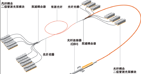 圖 1:Coherent | Rofin 光纖激光振蕩器原理圖,包括12 個半導(dǎo)體激光 器泵浦模塊和6x1 光纖耦合模塊,后者將泵浦光注入增益光纖,使得激 光束可以高效地輸出。