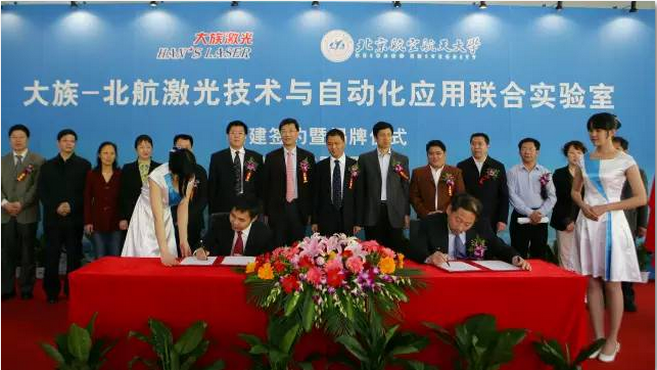 2011年5月7日,大族激光與北航開(kāi)展戰(zhàn)略合作,共建聯(lián)合實(shí)驗(yàn)室。圖為大族激光智能裝備集團(tuán)陳焱總經(jīng)理與北航實(shí)驗(yàn)室及設(shè)備管理處王榮橋處長(zhǎng)在共建協(xié)議書(shū)上簽字。
