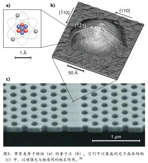 半導(dǎo)體量子點(diǎn)在三維尺寸上具有納米尺寸,使得它們的電子狀態(tài)由于緊約束而被量化。這些量子點(diǎn)也顯示出其他的類(lèi)單原子特性,如較強(qiáng)的光子反聚束和近壽命極限的線寬,通常被稱(chēng)為人造原子。它們是有趣的系統(tǒng),可用于實(shí)現(xiàn)量子位,并且由于半導(dǎo)體加工已被很好地理解,半導(dǎo)體量子點(diǎn)是可擴(kuò)展量子計(jì)算機(jī)尤為有希望的候選者。與實(shí)際原子不同,半導(dǎo)體量子點(diǎn)可以以固態(tài)的方式生長(zhǎng),像光子晶體腔和波導(dǎo)等其他結(jié)構(gòu)可以在其周?chē)鷺?gòu)建(見(jiàn)圖 5)。