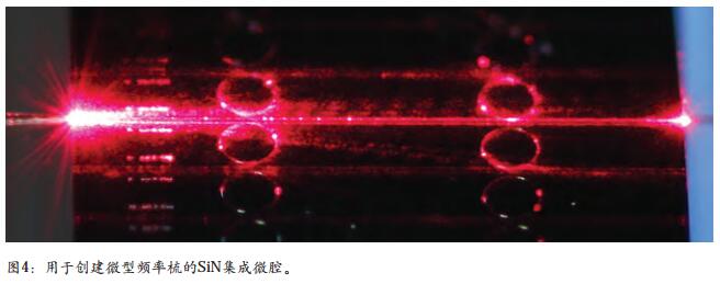 所得到的頻率梳的性質(zhì),在很大程度上取決于泵浦激光波長(zhǎng),因?yàn)镃W 激光器可以激發(fā)非相干高噪聲狀態(tài)以及孤子態(tài)。孤子態(tài)是有利的,因?yàn)樗玫降念l率梳是相干的并且具有極低噪聲、窄線寬和短脈沖。如果從較高頻率到較低頻率掃描泵浦激光器,將發(fā)生不同孤子態(tài)間的急變階段。每個(gè)階段對(duì)應(yīng)于在微諧振器中循環(huán)的孤子數(shù)量的連續(xù)減少。通過(guò)反饋至激光器,可以在其中一個(gè)階段穩(wěn)定微型梳,從而允許穩(wěn)定的孤子操作。圖 3所示為由可調(diào)諧二極管激光器泵浦氮化硅(SiN ;見(jiàn)圖 4)制成的這種微腔的光學(xué)單孤子光譜。
