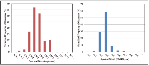 圖 4:柱狀圖顯示了 878.6 nm 半導(dǎo)體激光器的中心波長(zhǎng)(左)和光譜寬度(右)。泵浦二極管集中輸出波長(zhǎng)和收窄光譜寬度的能力可大大提升 Nd:YVO4 激光設(shè)備的輸出功率和光束質(zhì)量。