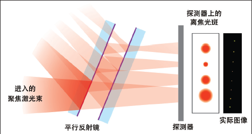 為了實(shí)現(xiàn)這一非常全面的測量,該器件采用了巧妙的光學(xué)裝置和布局(圖4),獲得了激光光斑的幾張同步、離焦圖像。進(jìn)入的聚焦光首先得到衰減,隨后被引導(dǎo)到相對(duì)于光軸方向傾斜的一對(duì)平行板位置。平面的兩個(gè)內(nèi)表面均涂有高反射涂層,使得每次反射時(shí)只有少量的光離開系統(tǒng)。該透射光在陣列檢測器上形成一連串斑點(diǎn),每個(gè)斑點(diǎn)沿光軸方向,隨著距離的增加顯示出光束輪廓??梢哉{(diào)節(jié)該光學(xué)裝置,使得檢測器上相鄰點(diǎn)之間的增量代表沿光軸方向的間隔介于100μm到12mm之間。系統(tǒng)軟件對(duì)這一系列的光斑圖像進(jìn)行分析,以得到所有上述提到的波束模式和束腰位置參數(shù)。