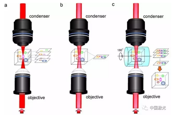 圖1 基于受激拉曼散射現(xiàn)象的容積成像模態(tài)。(a) 基于已有高斯光束受激拉曼顯微鏡的層析成像方法;(b) 基于貝塞爾光束的受激拉曼投影顯微成像方法;(c) 基于貝塞爾光束的受激拉曼投影斷層成像方法。