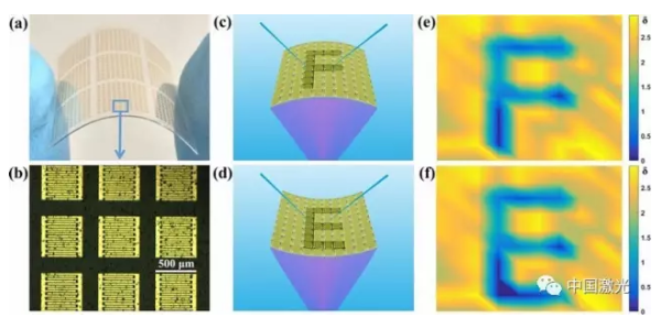 圖2  (a, b) 柔性紫外圖像傳感器的光學(xué)照片; (c, d) 柔性紫外圖像傳感器在不同彎曲條件下的測試示意圖; (e, f) 柔性紫外圖像傳感器對(duì)應(yīng)的輸出圖像。