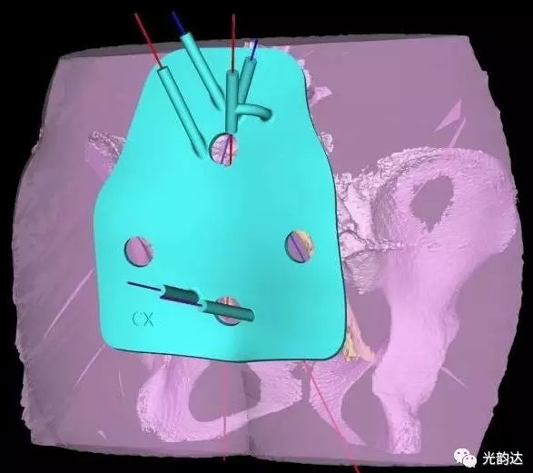 面對(duì)這一高難度的骶尾骨缺失結(jié)構(gòu),呂堅(jiān)偉果斷決定采用與光韻達(dá)數(shù)字醫(yī)療合作研制成功的骶神經(jīng)3D打印導(dǎo)航技術(shù)模擬重建患者的骶神經(jīng)結(jié)構(gòu),電極穿刺無(wú)需借助骶孔的指引,可直接根據(jù)CT與MR融合后的圖像進(jìn)行穿刺路徑設(shè)計(jì),此方法能使電極位置更精地確貼近骶神經(jīng),比傳統(tǒng)穿刺方法更精準(zhǔn)。