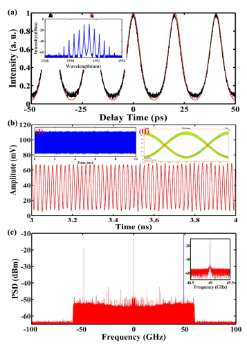 其次,在傅里葉變換極限超窄譜片上鎖模激光技術(shù)方面取得重要突破。傳統(tǒng)鎖模技術(shù)常被用來(lái)實(shí)現(xiàn)超短脈沖,研究者更多地將鎖模技術(shù)用于展寬頻譜帶寬以實(shí)現(xiàn)超短、亞皮秒級(jí)甚至阿秒級(jí)的激光脈沖,而傅里葉變換極限超窄譜片上納秒脈沖的鎖模激光器較難實(shí)現(xiàn),這種激光器因其頻譜帶寬比較窄,可以被廣泛應(yīng)用于光譜學(xué)測(cè)量、傳感器、相干光通信以及量子光學(xué)等領(lǐng)域。西安光機(jī)所和國(guó)外多家單位合作,利用非線(xiàn)性放大環(huán)路反射鏡實(shí)現(xiàn)了超窄譜的集成被動(dòng)式鎖模激光器,其中核心的環(huán)路反射鏡采用研究所特有的低損耗高折射率差高Q值微環(huán)諧振器。該激光器輸出的激光脈沖時(shí)域半高全寬(FWHM)為4.31ns,平均輸出光功率約為2.5mW,峰值功率可達(dá)約60mW,輸出振幅RMS<2.3%,譜寬104.9MHz,相比傳統(tǒng)降低2個(gè)數(shù)量級(jí)。該研究成果2017年發(fā)表于《自然-光子學(xué)》(Nature Photonics)期刊上。