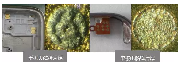 手機(jī)或者平板電腦的天線彈片,是用來發(fā)射或接收無線電波的電磁波器件,采用激光脈沖焊接方式將金屬彈片焊接在導(dǎo)電位上,可以起到抗氧化、抗腐蝕的作用,一般包括鍍金鋁、鍍銅鋼、鍍金鋼等作為彈片焊接到鋁合金或鎂鋁合金機(jī)殼的應(yīng)用。