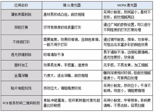 總的來說,在常見的標(biāo)刻應(yīng)用領(lǐng)域中,MOPA脈沖光纖激光器與調(diào)Q光纖激光器相比較,其主要特點(diǎn)如下表所示。用戶可根據(jù)對(duì)標(biāo)刻材料和效果的實(shí)際需要,正確選用合適的激光器。