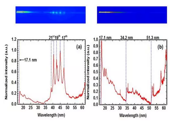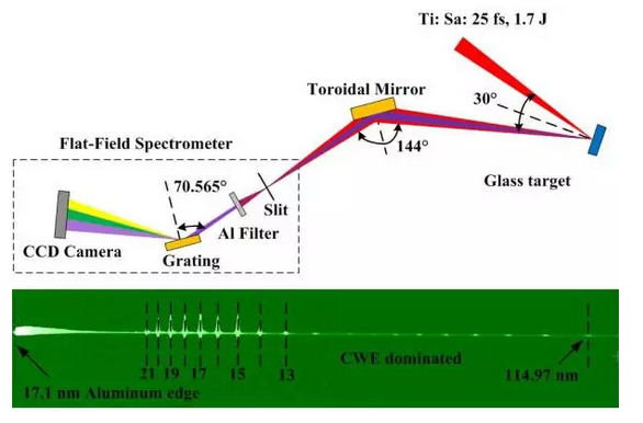 圖3 上圖為實(shí)驗(yàn)裝置示意圖;下圖為實(shí)驗(yàn)獲得的高次諧波原始圖像