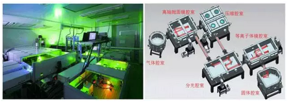 圖2 實(shí)驗(yàn)系統(tǒng):左圖為200TW激光系統(tǒng);右圖為靶場示意圖。(圖片來源:上海交通大學(xué)激光等離子體實(shí)驗(yàn)室)