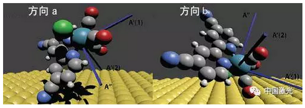 圖4 由 HD 2D SFG 和 IRRAS(紅外反射吸收光譜)測量法得到的金表面上靶向催化劑的方向,使用 DFT(密度泛函理論)模擬。方向 a 是較佳方案。藍(lán)棒代表振動模式方向。