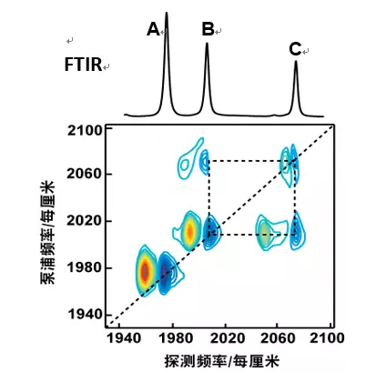 圖1 實驗測得混合化合物的傅里葉紅外光譜(FTIR)(上)和 二維紅外光譜(2D-IR)(下)。通過 FTIR ,無法確定混合物中包含多少種分子,對應(yīng) FTIR 中的每個峰值,2D- IR會呈現(xiàn)一對對角峰。2D- IR 光譜中的交錯峰顯示頻率較高的兩個峰(B 和 C)彼此耦合,表明它們屬于相同分子。A則來自樣品中的其他分子。