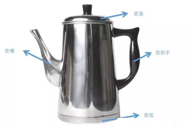普通的不銹鋼水壺由五部份組成:壺嘴、壺蓋、壺抓手、壺身、壺底,如圖。在我們看到光鮮亮麗的水壺之前,它的制作工序有多達十多道,由一塊普通的不銹鋼板經(jīng)加工剪切后,再修整沖壓成所需形狀后,再進行焊接拋光,到最后的清洗包裝。