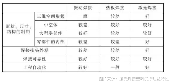 目前已有多種塑料焊接方法,如:超聲波焊接、摩擦焊接、振動(dòng)焊接、熱板焊接,各種焊接方法適合不同尺寸、形狀的焊接部件,優(yōu)劣比較見(jiàn)下圖。