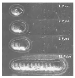 圖9 :通過“擺動”脈沖形成脈沖焊縫。激光頻率fp = 10Hz,脈沖持續(xù)時間tp = 20ms,擺動頻率fw = 600Hz。