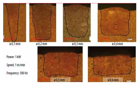 以下這些焊縫橫截面揭示了該技術(shù)的另一個優(yōu)點:擺動直徑可被用于定制焊縫橫截面的形狀。小的擺動直徑會形成激光焊接的典型V形橫截面,而較大的直徑能夠?qū)⒑缚p從V形變?yōu)閁形或非常規(guī)則的矩形(圖7)。如果單位長度焊縫的能量輸入恒定(E = P vw),則焊縫橫截面幾乎保持不變。這種技術(shù)使其能夠滿足特定應(yīng)用需求對焊縫橫截面的要求。