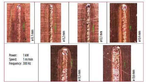 提供最佳結(jié)果的頻率設(shè)置取決于光斑尺寸、擺動直徑(以及由此得出的圓形光束速度vc)和線性焊接速度。圖5顯示了在恒定的焊接速度、激光功率和頻率,但擺動直徑不同的工藝條件下的焊縫表面。光斑尺寸在焦距f = 300mm處約為30μm。激光功率保持為恒定的1kW,而線性焊接速度設(shè)定為1m/min。如果沒有擺動運動,這些參數(shù)將導致非常不穩(wěn)定的工藝,例如:過熱的熔池和氣孔。