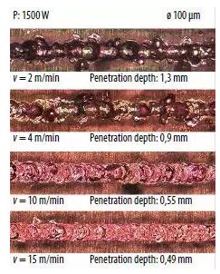 銅焊接工藝的另一個問題是低速焊接時的不穩(wěn)定性。通常,小于5m/min的焊接速度會面臨焊接不穩(wěn)定的問題,例如飛濺、氣孔和不規(guī)則焊縫表面。隨著焊接速度的加快,這種不穩(wěn)定性逐漸消失,焊接工藝趨向穩(wěn)定。在5-15m/min的焊速范圍,質(zhì)量達到可接受的水平。焊速高于15m/min的話,產(chǎn)生的焊縫基本沒有缺陷(圖3)。這意味著最佳的焊接參數(shù)介于傳統(tǒng)的運動系統(tǒng)(例如機器人)所能達到的極限范圍內(nèi)。此外,焊縫深度隨著焊接速度的增加而減小,而焊縫也變得非常窄。