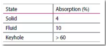 紅外激光器在處理固體材料時會產(chǎn)生吸收性問題。如果材料通過深熔焊發(fā)生了熔化甚至蒸發(fā),其吸收率則會顯著增加。固體銅的吸收率小于4%,而銅蒸汽(匙孔深熔焊)的吸收率則高于60%,參見表1。該吸收問題可以通過非常高的功率密度來克服,這大大加快了銅的熔化和蒸發(fā)速度,并因此增加其吸收性。