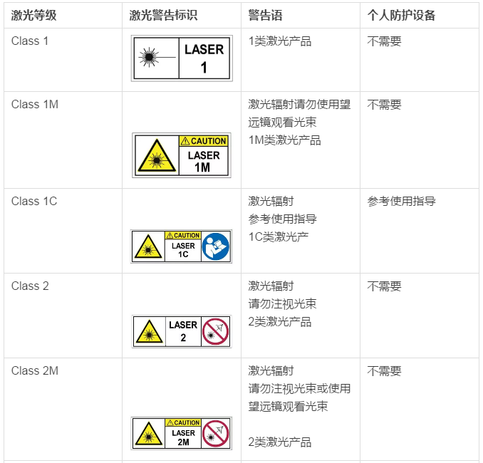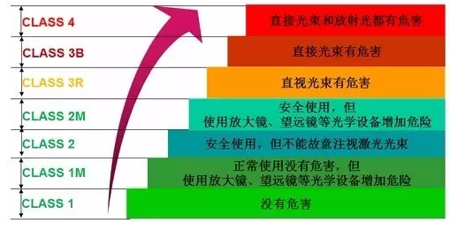 國際電工委員會標(biāo)準(zhǔn)(IEC 60825-1)依據(jù)激光產(chǎn)品的波長以及最大輸出激光功率,將激光產(chǎn)品分為了以下7個等級:1、1M、2、2M、3R、3B、4。 其中1M, 2M兩個等級代表產(chǎn)品的安全等級分別和1、2級一致,但在使用如望遠(yuǎn)鏡等光學(xué)設(shè)備時,可能將危害程度放大從而超越1、2級的危害。3級也分為3R和3B兩個子級別。