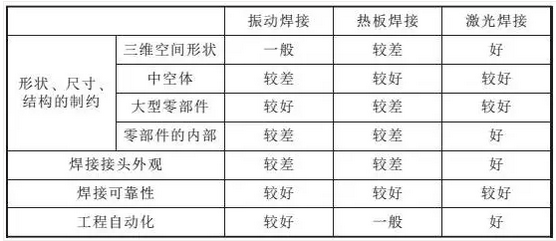 目前已有多種塑料焊接方法,如:超聲波焊接、摩擦焊接、振動(dòng)焊接、熱板焊接,各種焊接方法適合不同尺寸、形狀的焊接部件,優(yōu)劣比較見(jiàn)下圖。