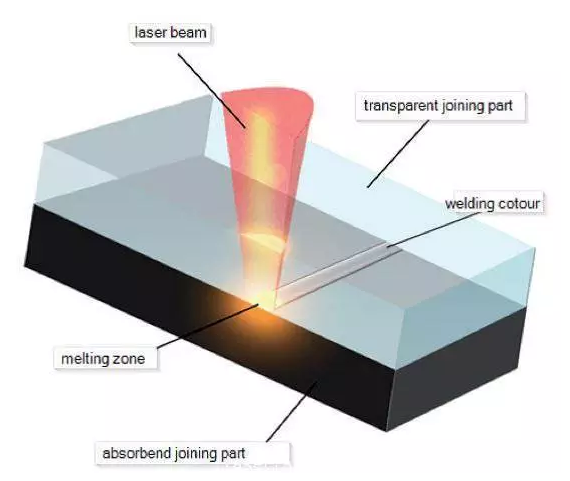塑料激光焊接要求焊接材料一方具有激光透過(guò)性,另一方則具有吸收性,稱為透過(guò)式塑料激光焊接。對(duì)于吸收性不足的材料,通常采用添加吸收劑(碳黑)的方式。只是碳黑也能吸收可見(jiàn)光,容易造成焊縫顏色變深,與母材顏色不同。英國(guó)焊接學(xué)會(huì)(TWI,The Welding Institute)已研制出對(duì)可見(jiàn)光透明的染料,可解決此問(wèn)題。