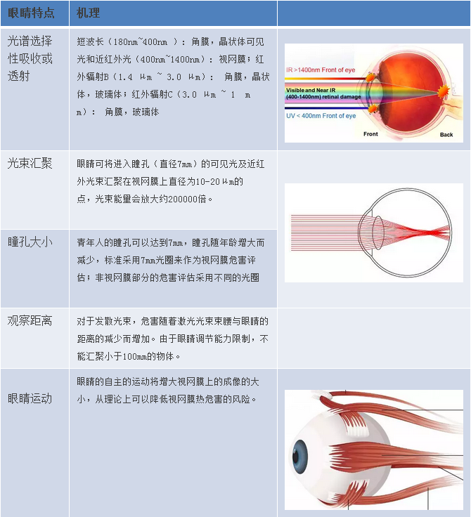 人的眼睛是復(fù)雜的光學(xué)器件,不同的組織對不同波長的激光吸收特性不同,危害的程度與輻射功率大小,瞳孔大小,觀看距離等都有關(guān)系。由于眼睛能將可見光和近紅外光透射并匯聚在視網(wǎng)膜上,危害程度會顯著增大。接下來,我們就通過一張表來了解決定激光對眼睛危害的關(guān)鍵參數(shù)。