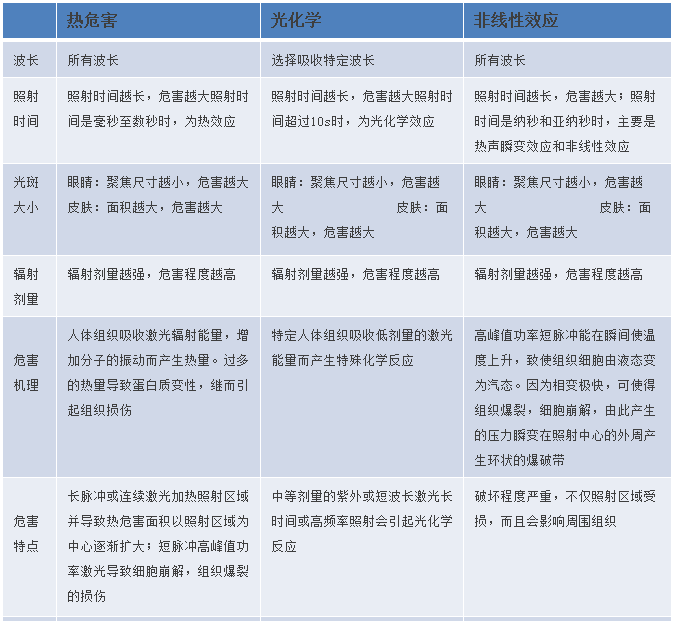 激光輻射對人體組織的危害機理包括熱危害、熱聲瞬變和光化學(xué)危害和非線性效應(yīng)。激光的危害是一個復(fù)雜的過程,通常是一種或者幾種危害的共同作用。危害的部位和程度取決于激光輻射的參數(shù),其中最重要的是波長、脈寬、聚焦尺寸、輻照劑量、輻射時間。激光對人體的危害匯總?cè)缦拢?/span>