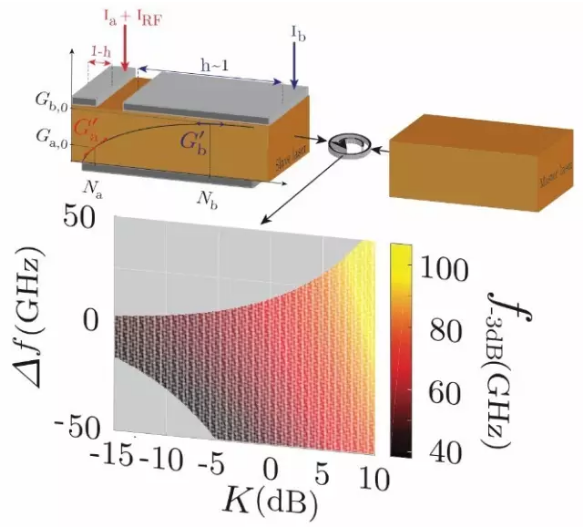 圖: 光注入增益杠桿半導體激光器的調制帶寬表現(xiàn)。上圖:激光器結構示意圖。包含一個短的調制部分和一個長的增益部分的增益杠桿激光器與外部主激光器耦合在一起。下圖:處于光注入增益杠桿激光器的穩(wěn)定鎖定區(qū)域的3 dB調制帶寬,增益杠桿激光器兩個部分的損耗率比g=10,增益壓縮因子ε = 10−16 cm3。