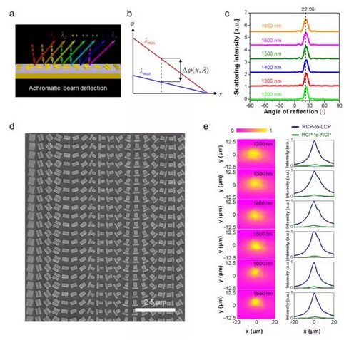 圖5 (a)連續(xù)寬帶消色差超構表面反射板示意圖;(b)不同頻率相位差示意圖;(c)理論計算各種頻率下消色差樣品的反射角度;(d)實驗制備消色差反射板的SEM圖;(e)實驗測試得到的反射效果