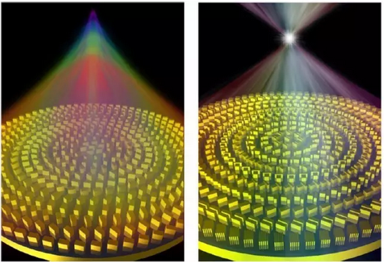 圖2 傳統(tǒng)色差的超構透鏡和消色差超構透鏡的結構和聚焦示意圖