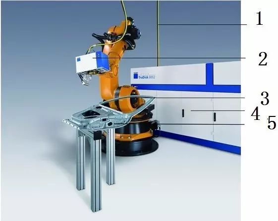 圖3    激光飛行焊基本組成結(jié)構(gòu),1.光釬  2.PFO  3.機(jī)器人  4.激光器  5.焊接件