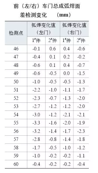 我公司某高端轎車車型在車門調(diào)試階段,對(duì)車門窗框部位的弧焊工藝焊后變形問題花費(fèi)了近半年時(shí)間攻關(guān)。弧焊后車門變形量最大達(dá)到3mm,前門窗框總成50%~70%的部位弧焊變形量超過0.7mm以上(見圖1及附表),而后車門總成達(dá)到了80%~90%部位弧焊變形。在進(jìn)行項(xiàng)目調(diào)試時(shí)需要花費(fèi)較大的人力物力才把該問題控制在可接受范圍。
