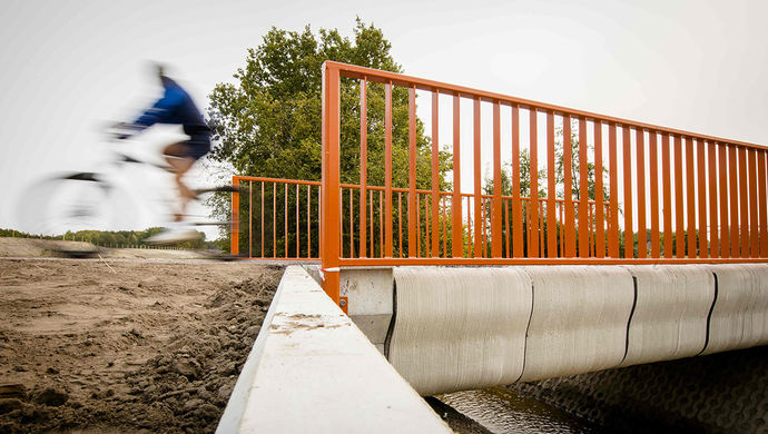 這座長(zhǎng)達(dá)8米(26英尺)的橋梁橫跨一條水渠,連接了兩條道路。埃因霍溫理工大學(xué)與荷蘭BAM建筑公司聯(lián)手對(duì)橋梁進(jìn)行了安全檢測(cè),最多可以承載高達(dá)兩噸的負(fù)荷。