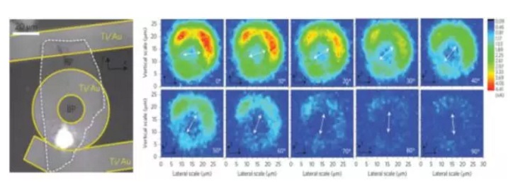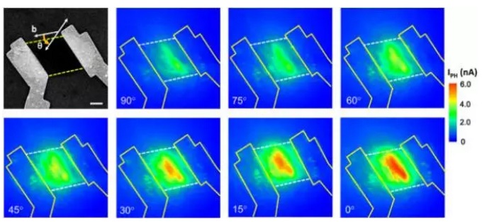 同年,斯坦福大學(xué)袁洪濤和崔屹等人將一塊黑磷薄片制作成上下垂直pn結(jié),有效分離光生載流子,如圖3所示,同時制作一個環(huán)狀電極,消除電極/黑磷邊緣對偏振探測的干擾。結(jié)果顯示黑磷具有明顯的偏振光敏感性。