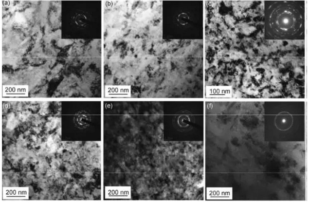 鈦合金激光沖擊在表層產(chǎn)生的納米晶層厚度約1 μm,晶粒尺寸分布為30-300 nm;鎳基高溫合金形成的納米晶層厚度為0.5-1 m,晶粒尺寸范圍為30-500 nm;沖擊1次表面納米晶分布還不均勻(圖1(a)-(c)),沖擊3-5次后,在多種金屬材料表面形成了取向隨機(jī)、等軸狀的納米晶(圖1(d)-(f))。從不同金屬材料激光沖擊表面納米化過(guò)程與特征來(lái)看,晶粒細(xì)化機(jī)制主要取決于材料本身的結(jié)構(gòu)與沖擊波參數(shù)。