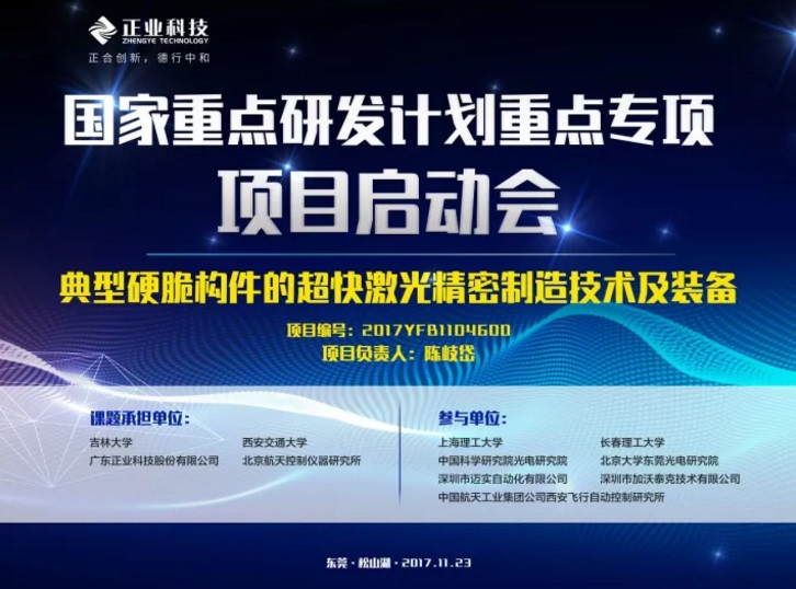 11月23日上午,國家重點研發(fā)計劃“增材制造與激光制造”重點專項——典型硬脆構(gòu)件的超快激光精密制造技術(shù)及裝備(項目編號:2017YFB1104600)項目啟動會在正業(yè)科技總部隆重舉行。
